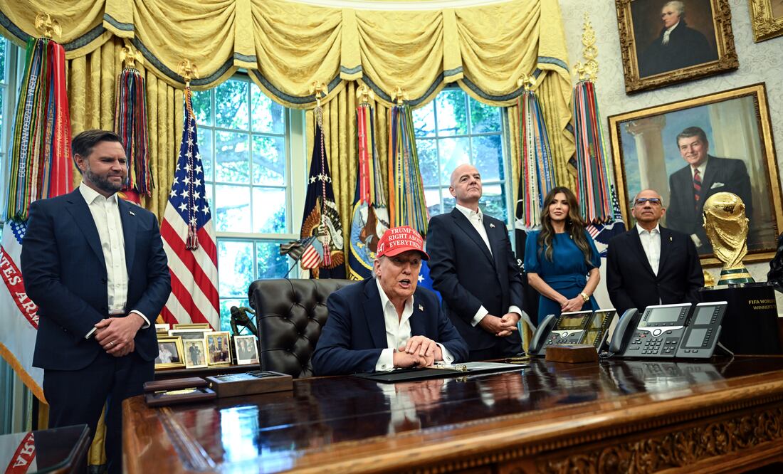 A photograph taken in the Oval Office has begun circulating widely on social media, sparking debate, theories, and speculation about the unusual detail captured within it. The image shows former U.S. President Donald Trump standing at the center, flanked by two officials during a ceremonial presentation of the FIFA World Cup trophy. What immediately caught the attention of observers is not the trophy, nor Trump’s signature red hat, but the fact that none of the men in the room are wearing neckties.